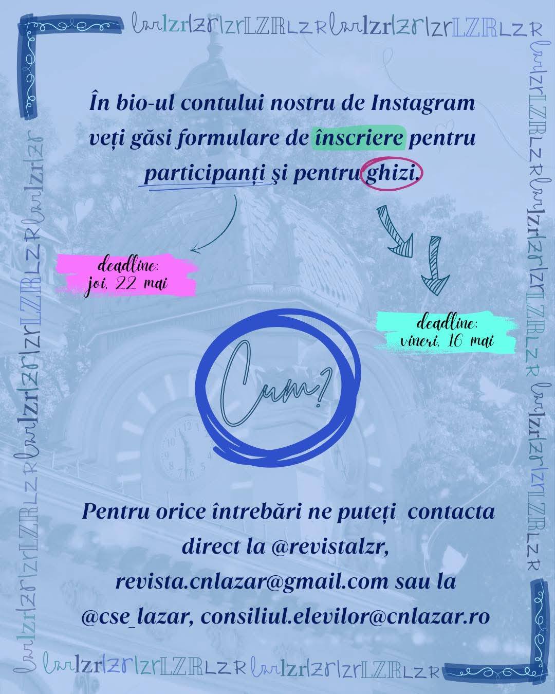 Invităm totodată și elevii din liceul nostru să se înscrie drept ghizi pe link-ul din bio până vineri, 16 mai, pentru a le oferi lăzăriștilor aspiranți un tur de neuitat și plin de inside-uri lăzăriste.